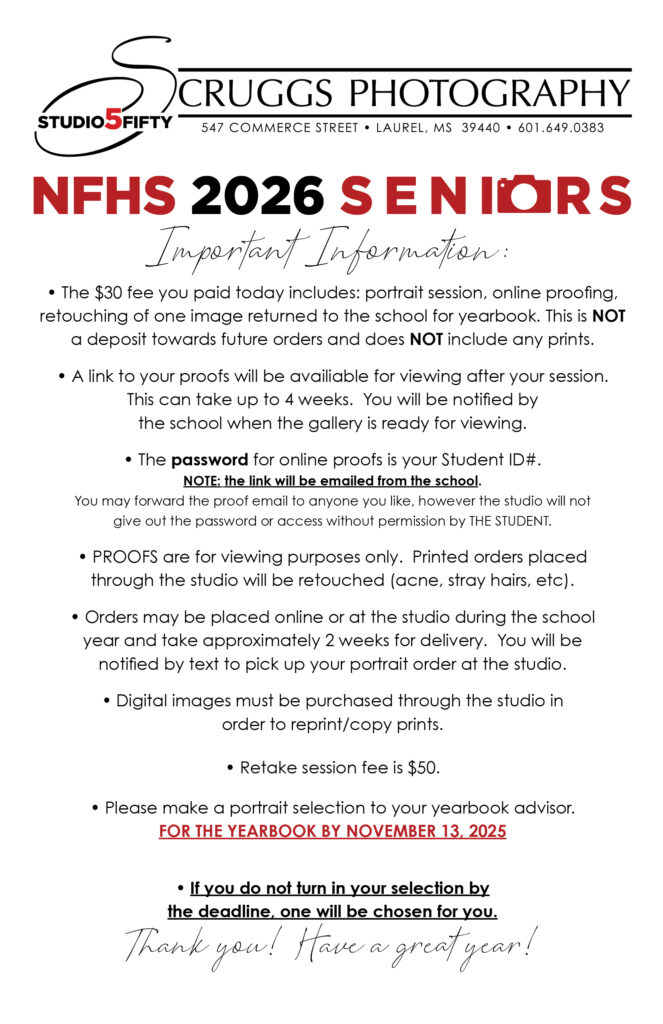 Senior Portraits for NFHS are taken during the fall of Senior Year. Photos will be taken at the school (date TBD).